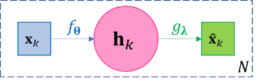 (2.13)¶\[\mathbf{x}_{k} \approx {\widehat{\mathbf{x}}}_{k} = g_{𝛌}\left( f_{𝛉}\left( \mathbf{x}_{k} \right) \right),k = 1,\ldots,N\]Figure 3-4 The diagram of basic autoencoder.