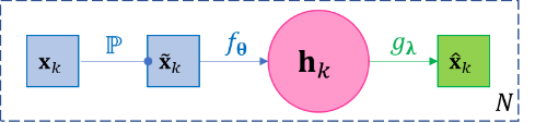 A widely used variant of the vanilla autoencoder model in Eq.2.13 is named denoising autoencoder (DAE), whose objective is to reconstruct the original data even when the input data are corrupted, or simply put DAE is trying to be more robust than the vanilla model. Besides finding a robust representation, an immediate application of DAE is clearly data denoising – given corrupted data, estimating the original data. The basic DAE is straightforward, but assumes the data in the training set is noiseless. Then a stochastic layer \({\widetilde{\mathbf{x}}}_{k}\mathbb{\sim P}\left( \cdot |\mathbf{x}_{k} \right)\) is added between \(\mathbf{x}_{k}\) and \(\mathbf{h}_{k}\), which means a noisy sample is first drawn from a distribution dependent on \(\mathbf{x}_{k}\) (e.g. with \(\mathbf{x}_{k}\) as its mean, or randomly setting some components of \(\mathbf{x}_{k}\) as zero, depending on the modeling needs), and then input \({\widetilde{\mathbf{x}}}_{k}\) into the encoder-decoder process as the following. \(\mathbb{P}\) is predefined and has no learnable parameters; \({\widetilde{\mathbf{x}}}_{k}\) needs to be resampled for every iteration or at least for every few iterations of training to avoid bias. Note the loss function \(ℓ\) is still defined for reconstruction \({\widehat{\mathbf{x}}}_{k}\) s and original input \(\mathbf{x}_{k}\) s.