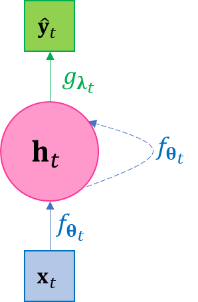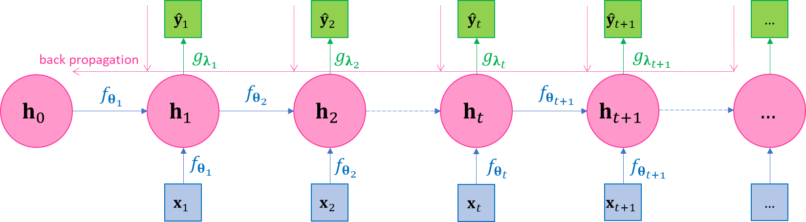 For Eq.2.1, note very often we may use time-homogenous parameters, i.e. letting \(𝛉_{t} \equiv 𝛉_{1}\) and/or \(𝛌_{t} \equiv 𝛌_{1}\) to reduce model complexity. Also note the dimensions of different variables in the network: a data vector \(\mathbf{x}\), a hidden state vector \(\mathbf{h}\) and a target vector \(\mathbf{y}\) may have different dimensions; even a regressed vector \({\widehat{\mathbf{y}}}_{t}\) and its corresponding target vector \(\mathbf{y}_{t}\) can have the different dimensions, as long as a proper differentiable loss function can be chosen for them, see the later example of Eq.2.12.