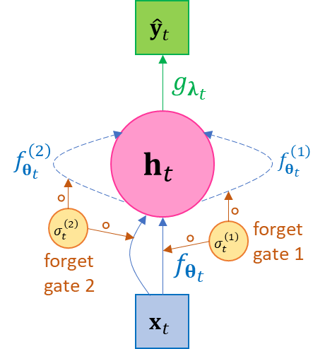 (2.9)¶\[\begin{split}\begin{aligned} \mathbf{h}_{1} &= \sum_{j = 1}^{K}{σ^{\left( j \right)}\left( \mathbf{h}_{0},\mathbf{x}_{1};𝛉_{1}^{\left( σ,j \right)} \right) \circ f^{\left( j \right)}\left( \mathbf{h}_{0},\mathbf{x}_{1};𝛉_{1}^{\left( j \right)} \right)},{\widehat{\mathbf{y}}}_{1} = g\left( \mathbf{h}_{1};𝛌_{1} \right) \\ \mathbf{h}_{2} &= \sum_{j = 1}^{K}{σ^{\left( j \right)}\left( \mathbf{h}_{1},\mathbf{x}_{2};𝛉_{2}^{\left( σ,j \right)} \right) \circ f^{\left( j \right)}\left( \mathbf{h}_{1},\mathbf{x}_{2};𝛉_{2}^{\left( j \right)} \right)},{\widehat{\mathbf{y}}}_{2} = g\left( \mathbf{h}_{2};𝛌_{2} \right) \\ \mathbf{h}_{3} &= \sum_{j = 1}^{K}{σ^{\left( j \right)}\left( \mathbf{h}_{2},\mathbf{x}_{3};𝛉_{3}^{\left( σ,j \right)} \right) \circ f^{\left( j \right)}\left( \mathbf{h}_{2},\mathbf{x}_{3};𝛉_{3}^{\left( j \right)} \right)},{\widehat{\mathbf{y}}}_{3} = g\left( \mathbf{h}_{3};𝛌_{3} \right) \\ & \ldots \\ \mathbf{h}_{N} &= \sum_{j = 1}^{K}{σ^{\left( j \right)}\left( \mathbf{h}_{N - 1},\mathbf{x}_{N};𝛉_{N}^{\left( σ,j \right)} \right) \circ f^{\left( j \right)}\left( \mathbf{h}_{N - 1},\mathbf{x}_{N};𝛉_{N}^{\left( j \right)} \right)},{\widehat{\mathbf{y}}}_{N} = g\left( \mathbf{h}_{N};𝛌_{N} \right) \end{aligned}\end{split}\]Figure 3-3 The folded diagram of a 2-forget-gate LSTM.
