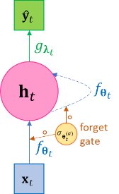 (2.10)¶\[\begin{split}\begin{aligned} σ^{\left( j \right)}\left( \mathbf{h}_{t - 1},\mathbf{x}_{t};𝛉_{t}^{\left( σ,j \right)} \right) &:= \text{sigmoid}\left( \mathbf{b}^{\left( σ,j \right)} + \mathbf{U}^{\left( σ,j \right)}\mathbf{h}_{t - 1} + \mathbf{V}^{\left( σ,j \right)}\mathbf{x}_{t} \right),j = 1,2 \\ f^{\left( 1 \right)}\left( \mathbf{h}_{t - 1},\mathbf{x}_{t};𝛉_{t} \right) &:= \mathbf{h}_{t - 1} \\ f^{\left( 2 \right)}\left( \mathbf{h}_{t - 1},\mathbf{x}_{t};𝛉_{t} \right) &:= \text{sigmoid}\left( \mathbf{b}^{\left( f \right)} + \mathbf{U}^{\left( f \right)}\mathbf{h}_{t - 1} + \mathbf{V}^{\left( f \right)}\mathbf{x}_{t} \right) \\ g\left( \mathbf{h}_{t};𝛌_{t} \right) &:= \text{sigmoid}\left( \mathbf{b}^{\left( g \right)} + \mathbf{U}^{\left( g \right)}\mathbf{h}_{t} + \mathbf{V}^{\left( g \right)}\mathbf{x}_{t} \right) \circ \tanh\left( \mathbf{h}_{t} \right) \end{aligned}\end{split}\]The we have a hidden state transition as in Eq.2.11, similar to Eq.2.7 but with independent sigmoid functions applied to the two addends.