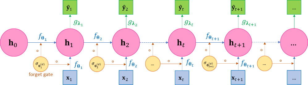 A well-known variant of RNN Eq.2.1 is the long short-term memory network (LSTM), whose essential idea is to introduce the vector-valued forget rate function or forget gate function or damping factor function \(σ_{𝛉^{\left( σ \right)}} = \left( σ_{1},\ldots,σ_{m}\ \right)_{𝛉^{\left( σ \right)}} \in \left\lbrack 0,1 \right\rbrack^{m}\) to the hidden states such as the following, where “\(\circ\)” denotes element-wise product,(2.5)¶\[\begin{split}\begin{aligned} \mathbf{h}_{1} &= σ\left( \mathbf{h}_{0},\mathbf{x}_{1};𝛉_{1}^{\left( σ \right)} \right) \circ f\left( \mathbf{h}_{0},\mathbf{x}_{1};𝛉_{1} \right),{\widehat{\mathbf{y}}}_{1} = g\left( \mathbf{h}_{1};𝛌_{1} \right) \\ \mathbf{h}_{2} &= σ\left( \mathbf{h}_{1},\mathbf{x}_{2};𝛉_{2}^{\left( σ \right)} \right) \circ f\left( \mathbf{h}_{1},\mathbf{x}_{2};𝛉_{2} \right),{\widehat{\mathbf{y}}}_{2} = g\left( \mathbf{h}_{2};𝛌_{2} \right) \\ \mathbf{h}_{3} &= σ\left( \mathbf{h}_{2},\mathbf{x}_{3};𝛉_{3}^{\left( σ \right)} \right) \circ f\left( \mathbf{h}_{2},\mathbf{x}_{3};𝛉_{3} \right),{\widehat{\mathbf{y}}}_{3} = g\left( \mathbf{h}_{3};𝛌_{3} \right) \\ \ldots \\ \mathbf{h}_{N} &= σ\left( \mathbf{h}_{N - 1},\mathbf{x}_{N};𝛉_{N}^{\left( σ \right)} \right) \circ f\left( \mathbf{h}_{N - 1},\mathbf{x}_{N};𝛉_{N} \right),{\widehat{\mathbf{y}}}_{N} = g\left( \mathbf{h}_{N};𝛌_{N} \right) \end{aligned}\end{split}\]We often call the forget gate function as simply a forget gate for simplicity and refer to the model represented by Eq.2.5 as the LSTM with single forget gate. It be viewed as a special design of the general form of RNN in Eq.2.1 by letting \(f\left( \mathbf{h}_{t - 1},\mathbf{x}_{t};𝛉_{t} \right) := σ\left( \mathbf{h}_{t - 1},\mathbf{x}_{t};𝛉_{t}^{\left( σ \right)} \right)f\left( \mathbf{h}_{t - 1},\mathbf{x}_{t};𝛉_{t} \right)\); or conversely you may also view RNN as a special case of the LSTM using constant \(σ_{𝛉^{\left( σ \right)}} \equiv 1\) as the forgetting rate. The philosophy behind LSTM is so that the effects of a hidden state \(\mathbf{h}_{t}\) should have a limited effect on a far-away future hidden states \(\mathbf{h}_{t + T},T \gg 0\) when more recent data are provided, or the network’s current state should gradually “forget” the far-away past and hence the “short-term” memory. This philosophy intuitively makes sense for many applications, e.g. today’s stock price is likely to be more dependent on this months’ historical prices, rather than last month’s price history. A concrete example of such “history forgetting” is in Eq.2.6 and Eq.2.8. The plate diagram of this general LSTM is given in Figure .